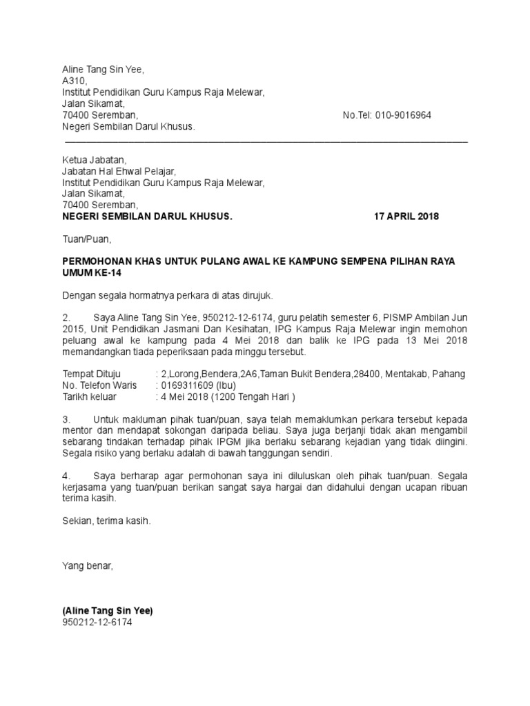 D110 institut pendidikan guru kampus. Text of surat permohonan balik kampung. Surat rasmi permohonan balik kampung.